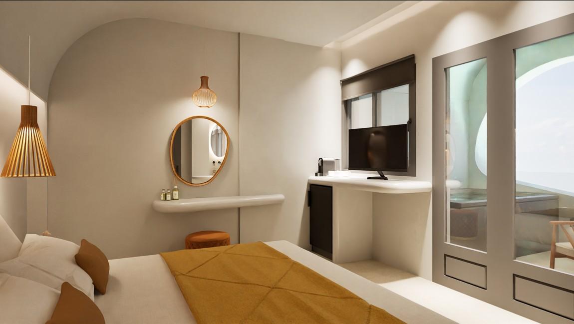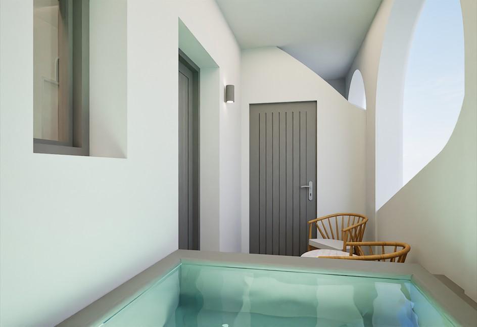 * Deluxe Double with Jacuzzi Rooms (8): Η επιτομή της χαλάρωσης, με ιδιωτικό τζακούζι στο μπαλκόνι για στιγμές αναζωογόνησης κάτω από τον ουρανό της Σαντορίνης.